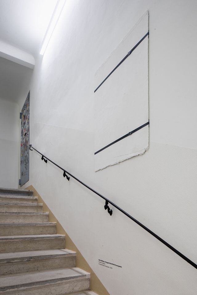 Im Jubiläumsjahr wurde die Kunsthalle Exnergasse endlich barrierefrei. Ein Aufzug fährt nun vom Hof hinauf in den ersten Stock. An dem Geländer des neuen Liftübergangs hat Andreas Fogarasi als Intervention ein historisches Metallornament angebracht. Für eine fortlaufende Werkreihe fischt der Wiener Künstler aus dem Schutt von Abbruchgebäuden einzelne Teile wie Fliesen, Fassaden-, Tür- oder Fensterelemente. Aus alten und teilweise auch aus neuen Baumaterialien stapelt er Objekte, die er dann verschnürt an die Wand hängt. Nun verwendete Fogarasi Fundstücke, die auf die Bau- und Industriegeschichte des WUKs referieren.