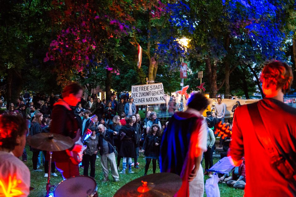 »Wie soll das urbane Zusammenleben der Zukunft organisiert sein? Wie können wir erreichen, dass alle Menschen, die in unserer Stadt leben, die selben Möglichkeiten und Rechte haben?« Fragen, die im Arrivati Park während der G20-Proteste in Hamburg diskutiert wurden. Foto (c) Rasande Tyskar