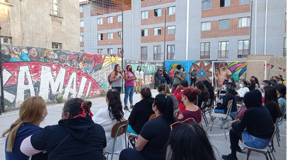 Versammlung im Hausprojekt Barrio Maestranza,Santiago de Chile; Filmstill aus dem Dokumentarfilm Aquí nadie se rindió, Mauricio Nilo, 2023
