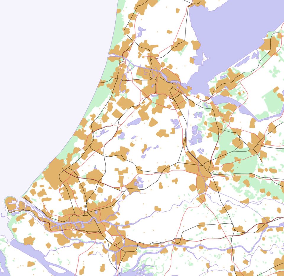 Randstad: Niederländische Metropolregion. Zur Randstad gehören die urbanen Gebiete von und um Amsterdam, Haarlem, Leiden, Den Haag, Delft, Rotterdam, Dordrecht, Gouda, Utrecht, Hilversum und Almere. Karte — Jeroencommons (CC BY-SA 3.0).