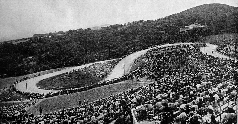 Der panoramatische Blick von der Ehrentribüne auf Wien, das Hotel Cobenzl und die letzten Serpentinen vor dem Ziel. Quelle — Motorwoche, 16.06.1939, S. 3.
