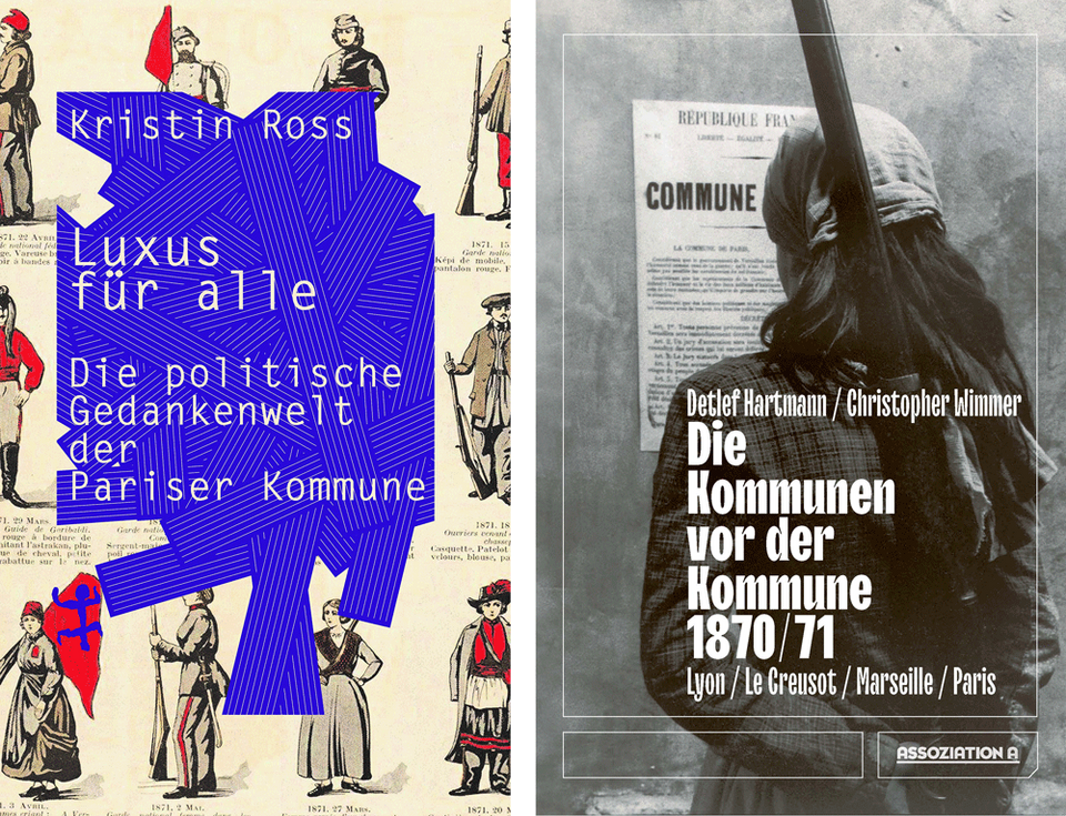 Auch in der Bundesrepublik findet 150 Jahre Pariser Commune vor allem auf der Literaturseite der Feuilletons statt. Zwei eher schlanke Publikationen von Kristin Ross sowie Detlef Hartmann und Christopher Wimmer beschreiten abseits der Geschichtsautobahnen neue Pfade. Während Hartmann und Wimmer die regionalen Kommunen von Lyon über die »industrielle Kommune« Le Creusot bis nach Algier als kaum enden wollende Abfolge von Revolten und Protesten der »Handwerker-Bauern« aufrufen, verfolgt die New Yorker Kulturwissenschaftlerin den langen Wellenschlag der Revolution entlang der Exilzeit geflohener Kommunard*innen und Zeitzeug*innen. Allerdings erinnern der Kölner Anwalt Detlef Hartmann und der Berliner Soziologe Christopher Wimmer daran, dass damals nur gebildete Schichten Lesen und Schreiben konnten. Somit sind zumindest die »Spuren ,der Straße‘ als Ort der Selbstorganisation der Aufständischen weitgehend verweht« (Hartmann & Wimmer, S. 115).