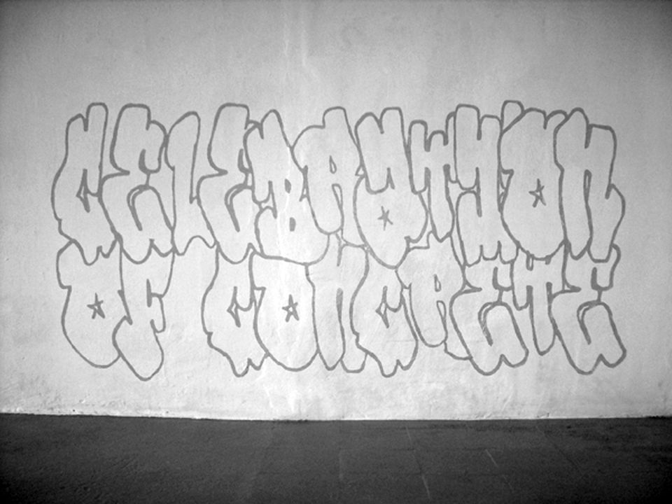 Aufgemacht wird der mit modernistischen Formen in zeitgenössischer Übersetzung spielende Raum durch Saim Demircans Celebration of Concrete (siehe Bild), ein graffitiartiges Fresko, das den historisierenden romantischen Gehalt des populär kulturellen Signifiers dokumentiert und sich im Zusammenwirken der anderen Arbeiten entfaltet: von der Teppichkopie, über das schwebende Lamellenmobile, die Biedermeierschäferinnenkörbchen-Stahlrohrkonstruktion, die Sitzbank des Produktdesigners George Nelson von 1947 bis hin zur Videodokumentation über den römischen Sozialbau Corviale – der in den 1970ern in Anlehnung an Le Corbusiers Konzept vom sozialen Wohnbau errichtet wurde: Der Salon ist eine brutale und gleichzeitig wundervoll spielerische Umsetzung einer entzauberten sozialen Utopie – einer Blauen Blume. Die Nichterreichbarkeit der Blauen Blume wird den BesucherInnen hier klar vor Augen geführt. Die Blaue Blume ist eine Herbstzeitlose, an der man sich vergiften kann. Gleichzeitig werden neue ideelle Blumen, ganz nach dem Vorbild des romantischen Dichters Novalis, gepflanzt. Unerwartete Blumen, die sich aus den im Video formulierten Träumen der interviewten BewohnerInnen in Corviale ergeben und den von Leichtigkeit getragenen Installationen, die den architektonischen Raum des Kunstvereins überhöhen, wie zum Beispiel die Berliner Wandelemente von Vaclav Pozarek und der hölzerne Strahlenschein new planet von Florian Roithmayr. Die utopisch-symbolische Raumwahrnehmung, welche die Räume des Kunstvereins in fiebrige und gleichzeitig kühle Sehnsuchtsbilder verwandelt, wird durch die metaphysischen Bilder von Katarzyna Kobros Stahlband und Hilary Lloyds Diaprojektion bunter Farbflächen noch verstärkt. Ein friedlicher und doch die Trägheit der Betrachter störender Rundgang durch drei Räume, als unendliche Suche nach der Urpflanze (frei nach Goethe) vergangener und zukünftiger Avantgarden.