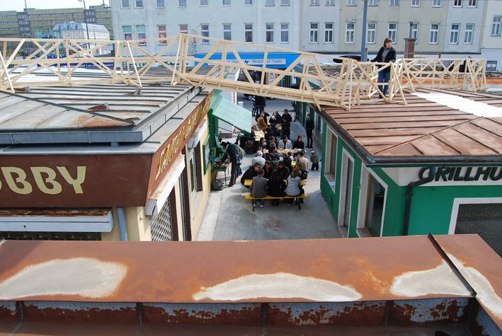 Die Ausstellungsserie springt also entlang von Orten der Transformation und Hoffnung durch die Stadt und öffnet auf Zeit für die Öffentlichkeit sonst geschlossene Orte. Dass parallel dazu der geregelte Kunstmarkt ebenfalls die Orte der Veränderung für sich entdeckt, scheint nicht weiter verwunderlich. Im Rahmen der viennafair wurde die ehemalige Markthalle in Wien Mitte als Ausstellungsort genutzt. Der Raum dient hier jedoch als Nebenschauplatz. Er ist eine Erweiterung des institutionellen Raums der Galerie.