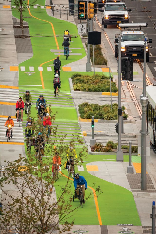 Aber zurück zum Ausgangspunkt und Titel der Ausstellung: Zeigt die Vielzahl der Beispiele nicht eher punktuelle Leuchtturmprojekte und weniger eine kollektive und umfassende Rückeroberung der Stadt? Grundlegende strukturelle Veränderungen im Hinblick auf den Ausbau der Radinfrastruktur und den damit einhergehenden Rückbau der autogerechten Stadt bleiben in den meisten Städten aus. Nach wie vor verhindern fehlende oder nur fragmentarisch vorhandene Radfahrspuren, parkende und unvorsichtig abbiegende Autos, Schlaglöcher und Luftverschmutzung ein sicheres und entspanntes Radeln in vielen Städten – davon ist in der Ausstellung wenig zu sehen. Und obwohl kaum noch jemand gegen die positiven Effekte der Radmobilität, wie dem geringeren Flächenverbrauch von Fahrrädern, der wegfallenden Luftverschmutzung sowie dem Beitrag zu Lebensqualität, Nachhaltigkeit und Klimaschutz, argumentiert, scheint es nach wie vor schwierig und sehr langwierig die Radinfrastruktur in Kommunen auszubauen. Doch warum sind selbst bei Neubauprojekten, wie dem Frankfurter Europaviertel, einem der größten europäischen innerstädtischen Stadtentwicklungsprojekte immer noch unzählige, offensichtliche Verkehrshindernisse wie Boller oder Gehsteige mitten auf dem Fahrradweg zu finden?