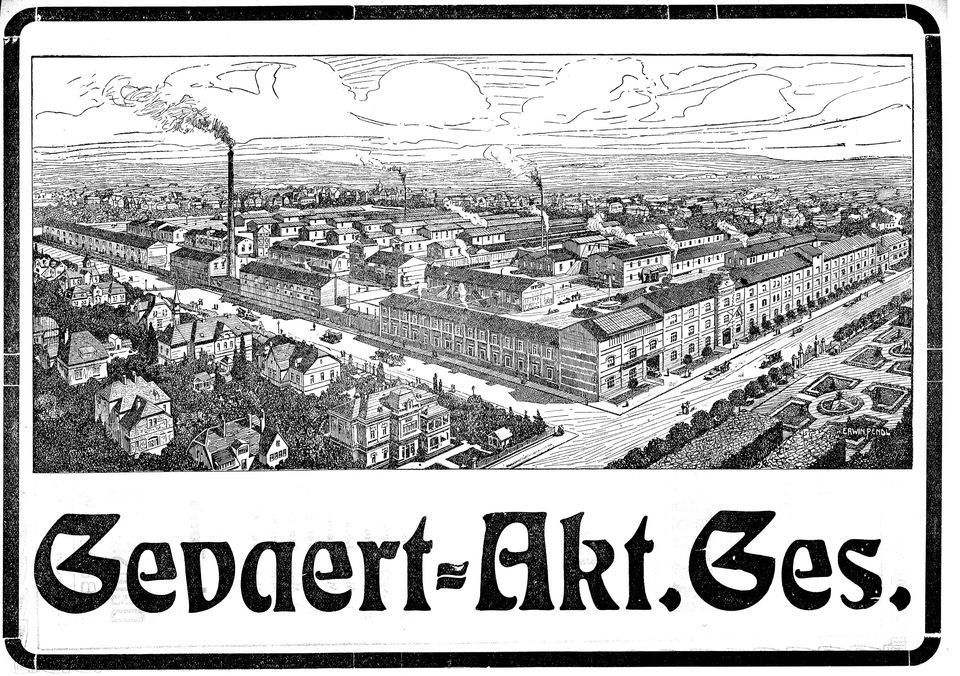 Abbildung 1: Die Rohfilmfabrik der Gevaert. Der dem Original beigefügte Text macht deutlich, wie groß die Anlage ist: 50.000 Quadratmeter - mit rauchenden Kaminschloten, Häusern und von Pferden gezogenen Karren. Das Kino wird zur Industrie und zur Stadt. Quelle: Deutscher Lichttheater-Besitzer, 13. April 1911, Nr. 15, o.S. Ebenso in La cinematografia italiana ed estera, 1-5 Märtz 1911, Nr. 101, S. 1228-1229)