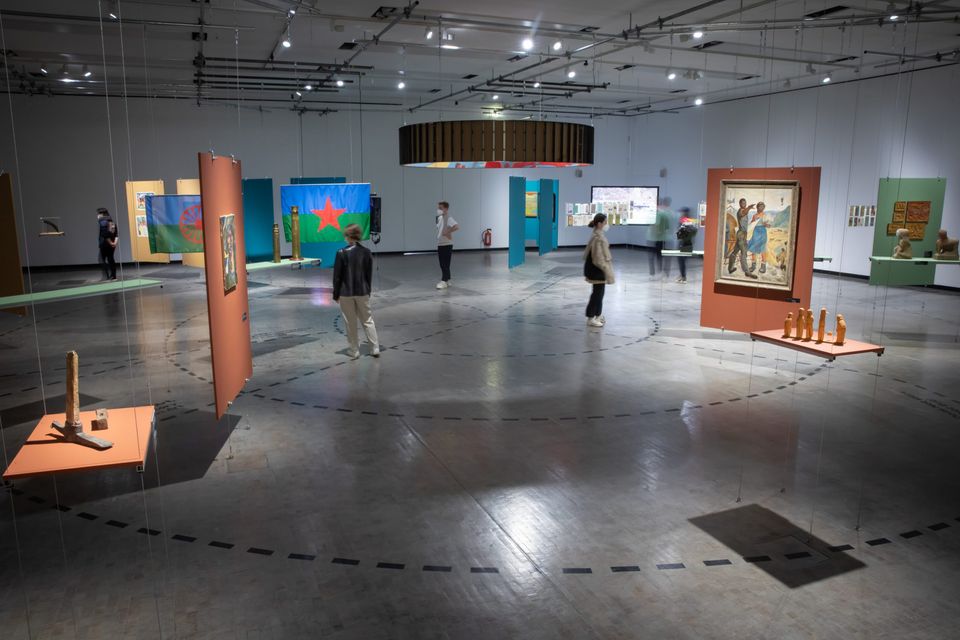 Inwieweit marginalisierten Gruppen wie den Rom*nja das Recht auf eine eigene kulturelle Identität verwehrt wird und was das im Kontext von musealer Repräsentation bedeutet, fragen sich die Ausstellungsmacher*innen – zum großen Teil selbst Künstler*innen – gleich im ersten Abschnitt. Wie selten Rom*nja-Kunst bisher im kunsthistorischen Kanon abgebildet und verankert ist, machen sie pointiert sichtbar. So sehen wir eine kleine Ansammlung von volkstümlichen Objekten und vernakulären Artefakten, die uns im ersten Moment unweigerlich in das Setting eines Volkskundemuseums versetzen, bei genauerem Hinsehen offenbaren sie sich allerdings als feine Details einer kritischen Betrachtung.