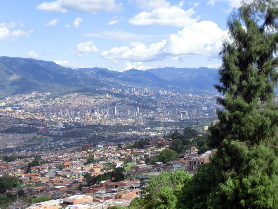 Medellín vom Nordwesten aus gesehen. Die Bürohochhäuser des Zentrums sowie die Wohntürm im reichen Süden bilden einen Kontrast zu den Siedlungen an den Hängen, Foto: Eva Schwab