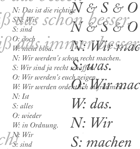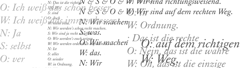 »Richtungswechsel« ist ein kurz-prägnantes und verbal schlagkräftiges Stück Straßen und Plätze[2]. Der rhythmisch durchgespielten Sprechfolge, die gewisse politische Zielrichtungen und populistische Redensart(en) widerspiegelt, entspricht eine formal einprägsame Bewegungsfolge, die den Ablauf der Szene körperlich zum Ausdruck bringt. Vier Personen nehmen mit fadenscheinigen Argumenten, die sie nur ihren realen Vorbildern abgehört haben können, beliebigen Spielraum für sich in Anspruch, wobei sie stets ein blaues Seil, in Kreuzform geknüpft, verbindet.