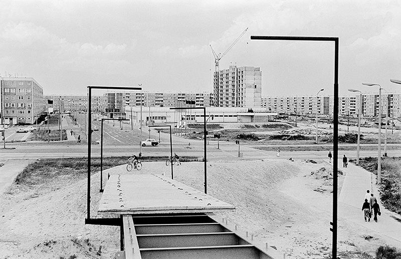 Blick auf das Sonnenblumenhaus, Rostock Lichtenhagen 1979; Foto — Detlev Seemann
