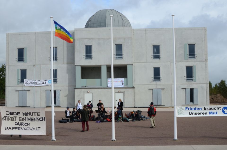 Die Musik- und Aktionsgruppe Lebenslaute gemeinsam mit der Gruppe Offene Heide bei einer Konzertaktion vor dem Regierungsgebäude des Bundeswehr-Übungsstadt Schnöggersburg in Sachsen-Anhalt am 3. Oktober 2017. Foto — Lebenslaute.