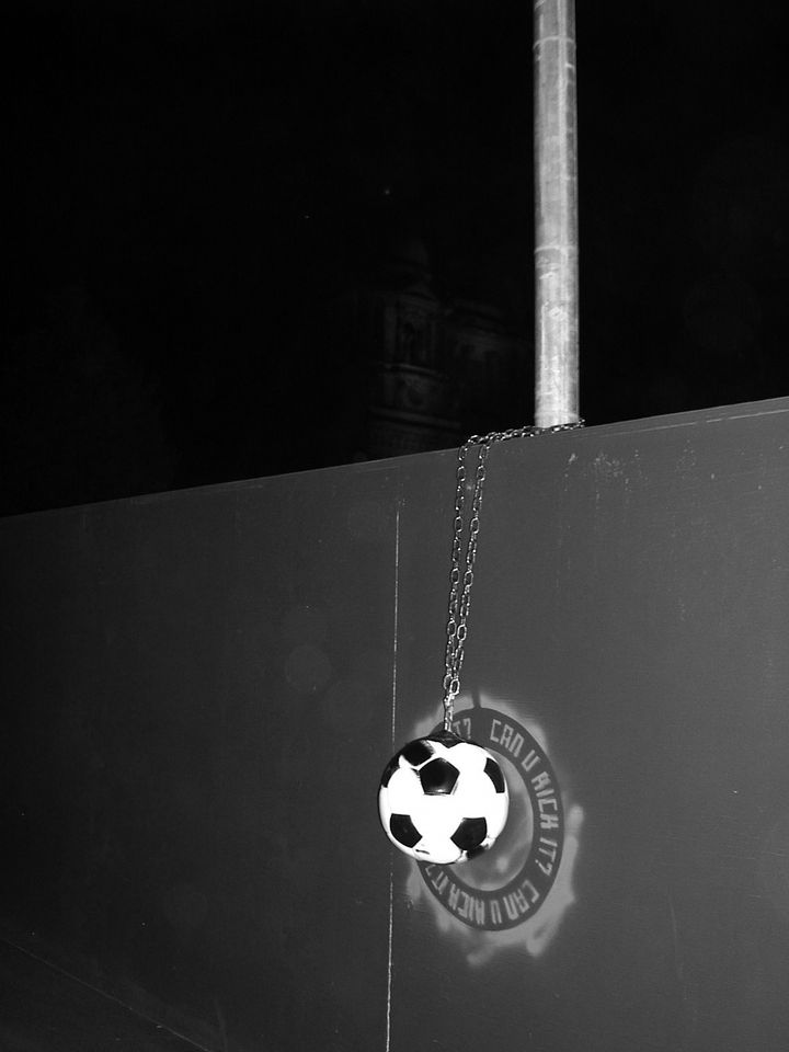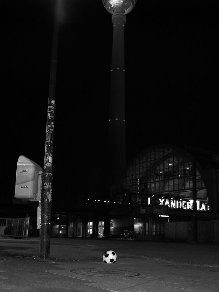 In Deutschland kam letzten Juli bekanntermaßen der WM-Ball ins Rollen. Und dabei war das runde Ding keineswegs immer aus Leder. Wer sich in die Event-City Berlin bequemte, konnte sogar den Fernsehturm am Alex mit rosa Sechseckverzierung bestaunen (verantwortlich waren die Werbestrategen eines mobilfunkenden Großsponsors) und überhaupt setzte es an allen Ecken und Enden WM-Logos, WM-Slogans, WM-Burger, WM-Filzhüte, WM-Schlag-mich-tot… Schwarz-Rot-Gold glänzte es auf allen Stirnen und wehte gar per Spezialgenehmigung von Heckspoilern und aus Seitenfenstern vorbeizischender Pkws, was des Radfahrers Überleben an Ampeln bisweilen ein wenig erschwerte. Selbst der Kunstbetrieb, warum auch nicht, wollte naturgemäß ein bisschen mitnaschen, und wo man auf sich hielt, bespielten reihenweise Elferscharen die White Cubes. Inmitten einer solchen schwarz-weiß-gekachelten Gesamtkomposition, die der Verfasser dieser Zeilen in medias res zu erleben das Vergnügen hatte, ein kleiner Knalleffekt: Von zunächst anonymer Hand im öffentlichen Raum hinterlegt, trieben sechzehn angekettete Betonfußbälle ihr Unwesen. Dabei taten sie im Eigentlichen wenig anderes als harmlos herumzuliegen. Wobei das mit dem Harmlosen so eine Geschichte ist, im öffentlichen Raum.