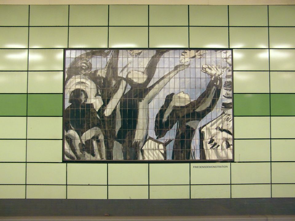 Wandgemälde Friedensdemonstration vonWolfgang Frankenstein und Hartmut Hornung in der U-Bahn-Station Magdalenenstraße., Foto: Ingolf