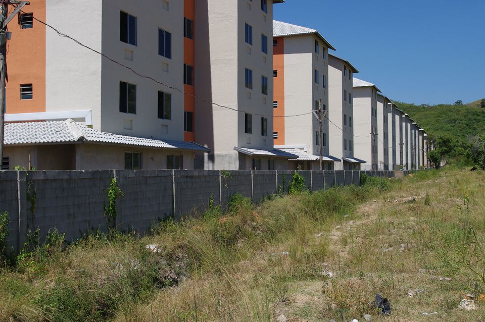 Siedlung des sozialen Wohnungsbauprogramms ›Minha Casa, Minha Vida‹ im Stadtteil Cosmos, der über 50 Kilometer vom Stadtzentrum entfernt am westlichen Rand von Rio de Janeiro liegt. Foto: Stephan Lanz, Februar 2014.