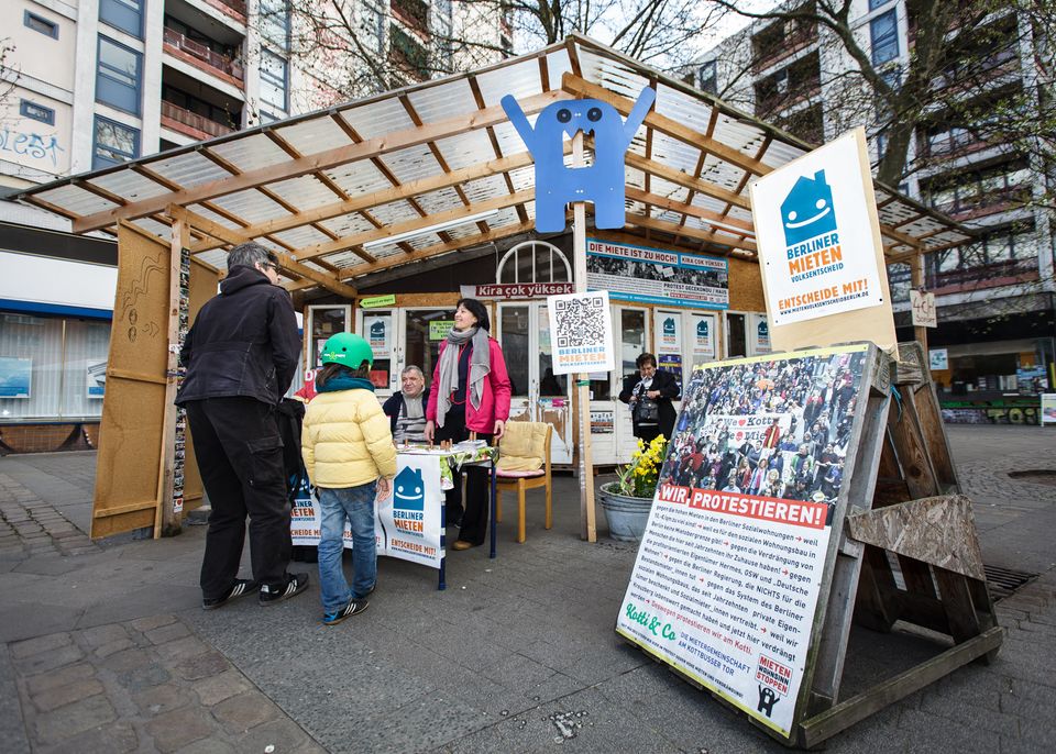 Berliner Mietenvolksentscheid: Infotisch beim Gecekondu am Kottbusser Tor; Berlin 2015; Foto – Mietenvolksentscheid Berlin