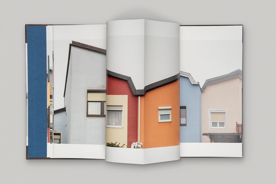 Gebaut ist das Buch aus zwei Blöcken mit je 16 doppelseitigen farbigen Bildtafeln, die zu einer kontinuierlich erscheinenden Fassadenfront montiert wurden, unterbrochen von zwei Blöcken mit Archivaufnahmen, S/W gestellt auf offenem Papier mit Vintage-Farbton, einer mit von der Künstlerin selbst bei den Bewohner:innen zusammengetragenen Fotos und der andere mit Fotos aus dem Archiv von Doris Pollet-Kammerlander. Den Abschluss bilden genretypisch kurze Texte von Martin Grabner und der Künstlerin. Die doppelseitigen Fotos im Kern öffnen sich nicht klassisch aus dem Buchrücken heraus nach vorne, sondern wirken wie eine Ziehharmonika, die von einem Leinenband gefasst und in ein solides Hardcover eingeklebt wurde.