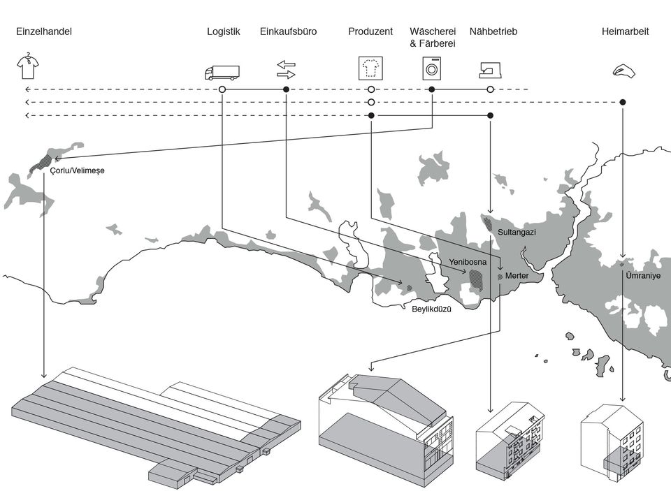 Welche Orte durchlaufen Kleidungsstücke während ihrer Herstellung in der Türkei, bevor sie in den deutschen Einzelhandel kommen? Wie konstituieren sich Stadträume entlang dieser transnationalen Produktions- ketten? Ein Forschungsprojekt über die städtebaulichen Auswirkungen globalisierter Güterproduktion.