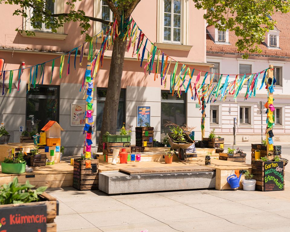 Auch wenn sie vielleicht gar nicht so sehr im Fokus der Besucher*innen stehen, sind die für das Grazer Annenviertel entstandenen fünf Inseln des Zusammenseins vermutlich das wichtigste Projekt im Sinne des Gefühls von Zugehörigkeit: temporäre Plateaus, die als Sitzgelegenheiten, Bühnen und Orte der Zusammenkunft genutzt werden können. Von verschiedenen Künstler*innen unter Mitwirkung zahlreicher Nachbar*innen und lokaler Initiativen entstanden, präsentieren sie sich als Alternativen zur Stadtmöblierung mit ihren impliziten Regulierungen und der um sich greifenden Verwandlung öffentlichen Raums in Konsumationszonen. Sie laden dazu ein, durch aktives Handeln in Besitz genommen zu werden, ohne dass es ein definiertes Format ihrer Verwendung gibt, präsentieren sich als Arbeitsarena, in der gelernt, diskutiert und darüber nachgedacht werden kann, was Arbeit eigentlich ist (gestaltet von der Belgrader Künstler*innengruppe minipogon) oder als Garten, der gemeinsam gepflegt werden will (Elina Otta, Garten der wachsenden Erkenntnis).