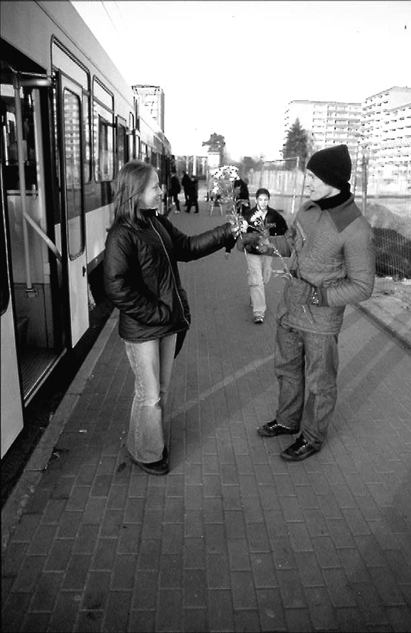 Präsenz der BürgerInnen im öffentlichen Raum. Am Mittwoch, den 17. 1. zwischen 18 und 19 Uhr projizieren wir Bilder von Cottbuser BürgerInnen in den öffentlichen Raum an der Kreuzung Gelsenkirchner Allee/ Kantstraße in Sachsendorf. Wenige Tage davor haben sich in Schmellwitz über 40 BürgerInnen bereit gefunden, sich hierfür fotografisch porträtieren zu lassen. Die Lausitzer Rundschau titelt am Tag nach den beiden Aktion: »Freundlichkeit schockiert – und bringt zum Reden«. Weiter heißt es: »mit einer Schockaktion kamen gestern in Sachsendorf Studenten mit Passanten ins Gespräch über rechte Gewalt. Mit Blumen und Kaffee wurden die Cottbuser an der Straßenbahnhaltestelle Gelsenkirchner Allee überrascht...« Bei der (scheinbaren) Harmlosigkeit der Aktionen vermutet man als OrtsunkundigeR Ironie des Reporters. Welche aber die alltägliche Atmosphäre im öffentlichen Raum in Sachsendorf, speziell nach Einbruch der Dunkelheit, kennen, wissen um die Brisanz, wenn Andere und Anderes den öffentlichen Raum in Beschlag nimmt.