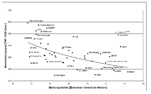 Motorisierung in Abhängigkeit von der Siedlungsdichte ausgewählter Schweizer Agglomerationen | Grafik © Anja Simma