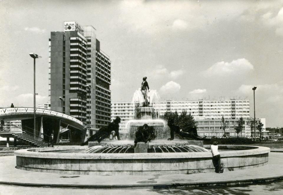 Postkarte Halle Neustadt (1976): Frauenbrunnen, Fußgängerbrücke, Magistrale. (Sludge G)