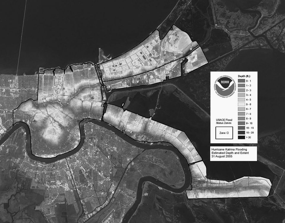 Am 29. August 2005 traf der Hurrikan Katrina auf New Orleans. Katrina war der sechststärkste Hurrikan, der je erfasst wurde. Nach dem Versagen einiger Dämme ergossen sich die Kanäle der Stadt in fast 80 Prozent des Stadtgebietes, das zum Teil bis zu drei Meter unter dem Meeresniveau liegt. Laut Statistik hat diese Naturkatastrophe 1.836 Menschen getötet, weitere 136 gelten nach wie vor als vermisst. 204.000 Häuser wurden zerstört oder beschädigt, zahlreiche öffentliche Einrichtungen wie Schulen und Krankenhäuser sind nach wie vor geschlossen. Erst ein volles Jahr nach der Katastrophe erklärte das Department of Environmental Quality die Luft und den Boden aller Stadtteile in New Orleans für sicher. Es war nicht nur die bislang verheerendste Naturkatastrophe in den USA, sondern durch ihre unmittelbaren Folgen auch die bis dato teuerste. Werden die durch Katrina überfluteten Gebiete betrachtet, so zeigt sich, dass die historischen Siedlungsgebiete entlang des Mississippiufers von der Flut verschont geblieben sind (vgl. Abb. 1 u. Abb. 2, S. 38/39). Die Stadt ist eine „Big Bowl“, wie sie von Einheimischen gerne genannt wird. Die höchsten Stadtteile liegen auf den Sedimenten des Mississippi und im Norden am Lake Pontchartrain, dazwischen – mit gut zehn Kilometer Luftlinie – erstreckt sich ein großes Becken, das unter Meeresniveau liegt. Die Stadtgründer haben schon gewusst, wo sie die ersten Siedlungsgebiete errichten, war es ohnedies mühsam genug, durch die umliegenden Sumpfgebiete bis zum heutigen French Quarter durchzukommen. Jetzt ist der Großraum New Orleans umgeben von einem über 500 Kilometer langen Dammsystem, das durch zahlreiche hochleistungsfähige Pumpsysteme unterstützt wird. Zahlreiche Bayous und Kanäle durchziehen die Stadt, das Wasser wurde gebannt, es ist jedoch nicht gänzlich verschwunden. Durch den zunehmenden Siedlungsdruck wurden über die Jahrzehnte immer neue Sumpfgebiete trockengelegt, Gebiete, die für die Besiedlung nicht optimal geeignet waren und unterhalb des Meeresspiegels liegen. Es wurden zahlreiche Teile der Stadt erschlossen, die nur unter der Voraussetzung eines funktionierenden und ausgeklügelten Damm-, Pump- und Schleusensystems besiedelt werden konnten. Für New Orleans war nicht der Hurrikan das große Problem, sondern die mangelhafte Infrastruktur – wie sich nach Katrina herausstellen sollte.