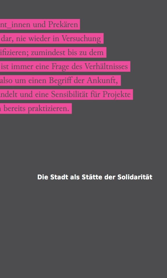 Im abschließenden Kapitel von Sheri Avraham und Niki Kubaczek geht es noch einmal darum, den Begriff der Solidarität unter die Lupe zu nehmen und das Konzept einer »emanzipatorischen Solidarität« zu entwickeln, dass der »fortwährenden Nationalisierung der Solidarität« entgegenwirkt. Es geht aufs Neue darum, wem Solidarität gebührt – nämlich »den Marginalisierten, den Ausgebeuteten und Unterdrückten« – und nicht, wie solidarische Strukturen für die ganze Stadtgesellschaft aufgebaut werden könnten. Schade.