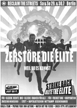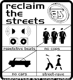 Reclaim the Streets (RTS) formierte sich 1991 in London und widmete sich in der ersten Phase ausschließlich dem Thema Auto: In einem der ersten Flugblätter hieß das »FOR walking, cycling and cheap or free public transport, and AGAINST cars, roads and the system that pushes them.« RTS unterschied sich so gesehen in den ersten Jahren ihres Bestehens der inhaltlichen Orientierung nach nicht sehr von einer einfachen BürgerInneninitiative. Was sie bereits damals zu etwas Besonderem machte, waren eher die Aktionsformen. Während der Nacht wurden Fahrradstreifen auf Straßen gemalt, Werbeplakate für Autoausstellungen wurden verfremdet etc.