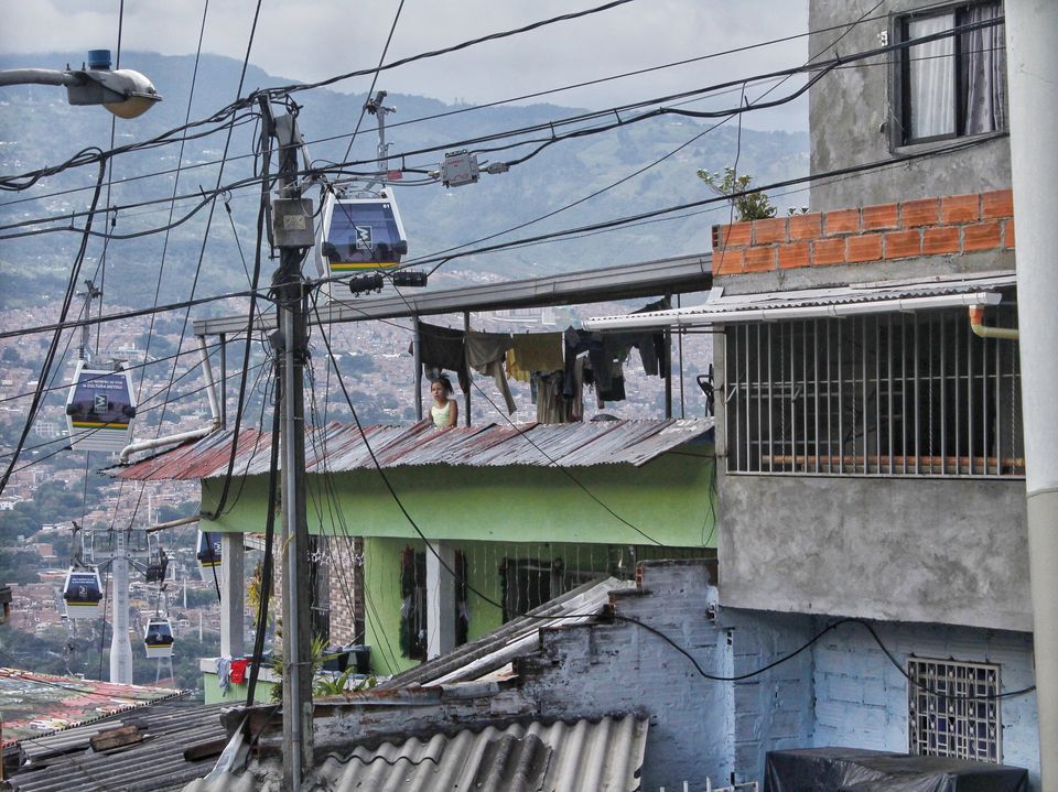 »Die Metroseilbahn bedeutet mehr Sicherheit, besonders für Frauen. Aber sie hat mich auch von meinen Nachbarn getrennt, verursacht Lärm und schränkt die Aussicht ein. Nachts ist die Gegend rund um die Station ein toter Ort geworden.« (Lina, Mutter und Bewohnerin des Barrios El Pinal, Metrostation Linie M, 2020). Foto — Juan Londoño.