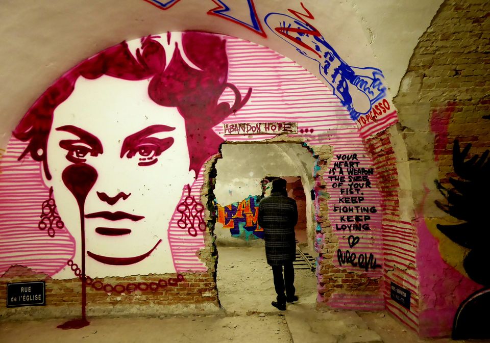 Im Dom des Kellers wird Nasty, einer Legende der französischen Streetart-Szene, zu Ehren eine Pariser Metrostation mit original, damals von ihm besprayten Wagen nachgebaut. Besprayte Metroschilder, die an die Anfänge der französischen Grafitti-Kunst in der »Malakoff – Plateau de Vanves«-Station erinnern sollen, liegen ebenfalls bereit. Ebendort steht, wie mal eben abgestellt, das monumentale Diptychon des oft als französischer Banksy bezeichneten Dran. Es zeigt ein verdächtig grimmiges Kind mit toter Maus auf Papier mit der Aufschrift »Life ist short«.