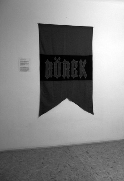 Die Arbeit von Erinç Seymen nähert sich über eine aktionistisch wirkende Videoperformance Performance For Poem Diskursen des Nationalismus, des Totalitären und von Gewalt. Die Kamera erscheint dabei wie das Opfer eines fiktiven Verhörs, welches nicht enden wollend jede Erträglichkeit übersteigt. Fast still dagegen wirken die beiden Bilder von Seymen, die wappenförmig eine Ikonografie der Verweigerung und der sich entziehenden Vereinnahmung von Macht und Intellektualismus manifestieren. Statt des vor Ort für Open Space geplanten Wandbildes hängt eine rote Fahne mit dem Schriftzug „Börek“, die auf den schon seit den Habsburgern andauernden „Krieg“ verweist.