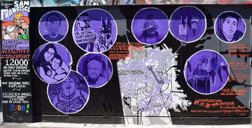 Narratives of Displacement mural in Clarion Alley by the Anti-Eviction Mapping Project and the Clarion Alley Mural Project, depicting a rendering of the online-map of no-fault evictions since 1997 and highlighting the portraits of eight San Franciscans fighting their eviction. www.antievictionmap.com/mural-in-clarion-alley