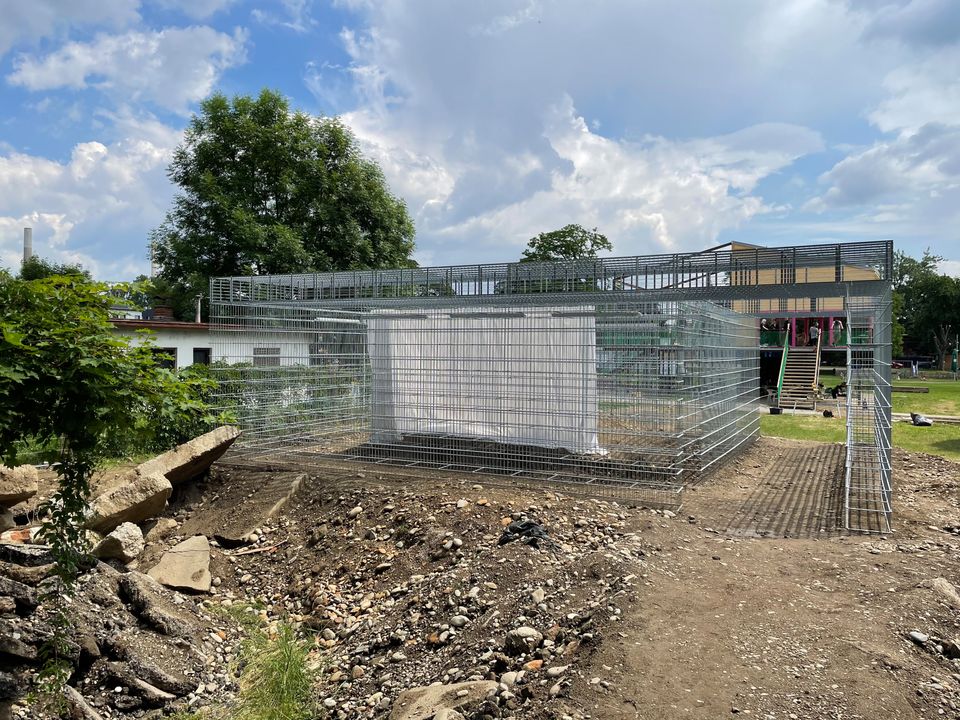 Zusätzlich zu den unterschiedlichen Programmpunkten, die im Club Hybrid stattfinden, präsentiert sich das junge Architekt*innen-Kollektiv AKT aus Wien bei einer Residency. Neben dem Haupthaus bespielen AKT unter dem Titel Wildes Kombinieren eine von ihnen bereits vorab kollaborativ errichtete Installation (14.06.–18.06). Als ,Gegen‘-Position zum kuratierten Club Hybrid soll die Konstruktion aus ungefüllten Gabionenkörben den Nutzer*innen möglichst freie Hand lassen. Das als AKT 4 betitelte Vorhaben reiht sich – wenn auch nicht direkt – an die vorhergehenden räumlichen Interventionen des Kollektivs an (AKT 1–3) – im Unterschied zu vorher haben dieses Mal alle Beteiligten gemeinsam und nur an einem Werk gearbeitet. Erbaut auf dem Aushub, der während des Abrisses der ehemaligen Gewächshäuser und der Errichtung des Club Hybrids entstanden ist, nimmt AKT 4 direkten Bezug auf die Grundelemente der Architektur: Mauer, Öffnung, Durchwegung, Zonierung und Sichtbeziehung – nicht mehr und nicht weniger. Dass die leeren Gabionenkörbe als formbildende Elemente genutzt wurden, kann man aber sicher auch als versteckte Kritik an deren Nutzung im militärischen Kontext und der Abgrenzungsmentalität vieler Einfamilienhausbesitzer*innen verstehen.