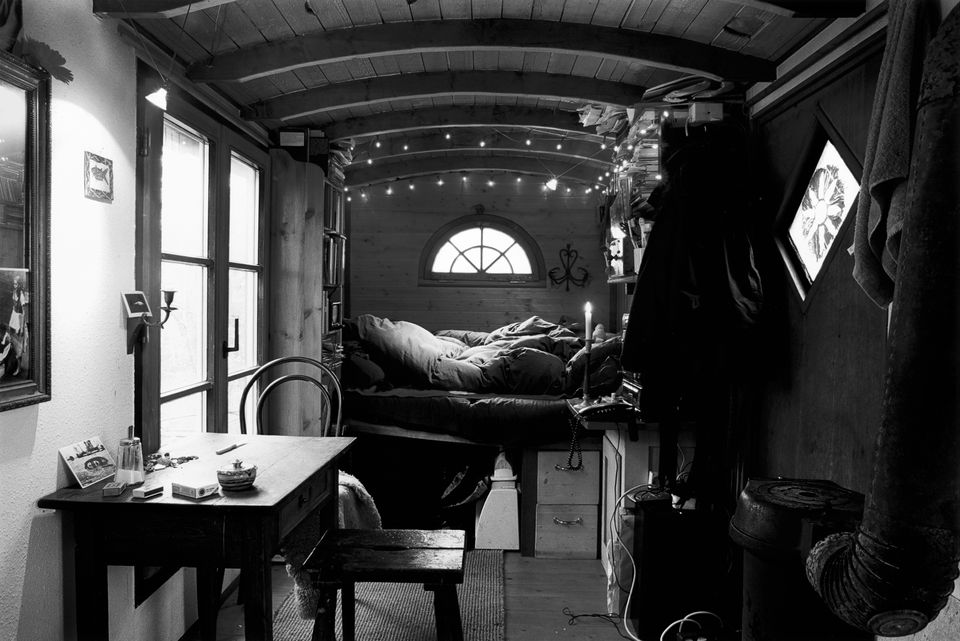 Canham konzentriert sich bei seinen Fotos auf die Innenräume der Bauwägen und hat alle aus zentralperspektivischer Sicht fotografiert, „um die Variationen innerhalb eines immer gleichen, sehr begrenzten Rahmens herauszuarbeiten“. Die Vorstellung, dass die BewohnerInnen hauptsächlich versiffte Hippies und Punks sein müssen und die Wägen dementsprechend eingerichtet sind, kann man bereits beim ersten Durchblättern als Irrtum beiseite schieben. Es offenbart sich ein durchaus breites Spektrum, das vom chaotischen Durcheinander über das Heimmusikstudio bis zur – fast möchte man sagen – geräumig wirkenden Gemütlichkeit reicht. Die BewohnerInnen selbst sind nie zu sehen, man erfährt allerdings, dass es sich sowohl um die erwarteten Hippies und Punks aber z.B. auch um Schauspieler, Gärtner oder Tai-Chi-Lehrer handelt. Klar wird jedenfalls, dass billiger Wohnraum nicht der alleinige Grund für das Bewohnen der Bauwägen sein kann. Die Motivation in eine Wagenburg zu ziehen ist vermutlich ähnlich wie die in einer WG zu wohnen. Kein isoliertes Nebeneinanderwohnen sondern (bei Bedarf) soziale Nähe und gemeinschaftliche Organisation des Wohnens.